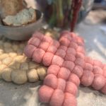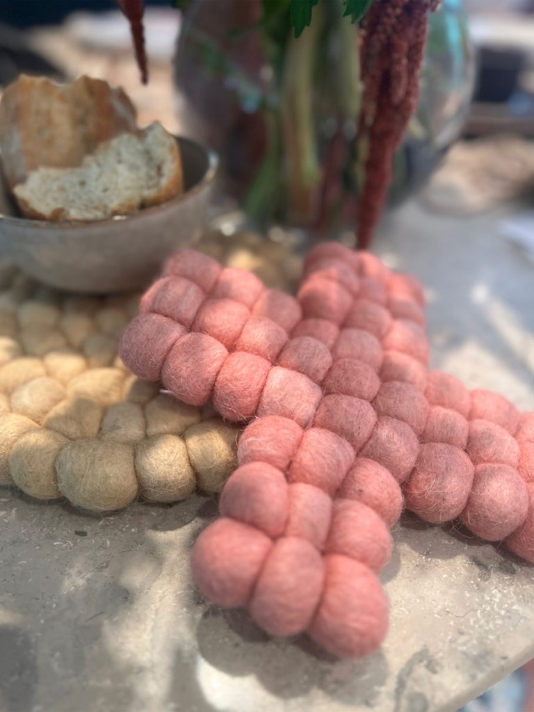 Pannunalunen huovutettua villaa, 2 erilaista. Suojaa pöytää kuumalta astialta.