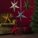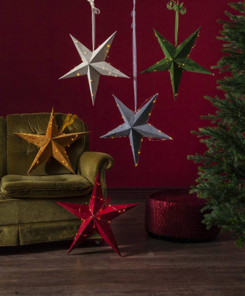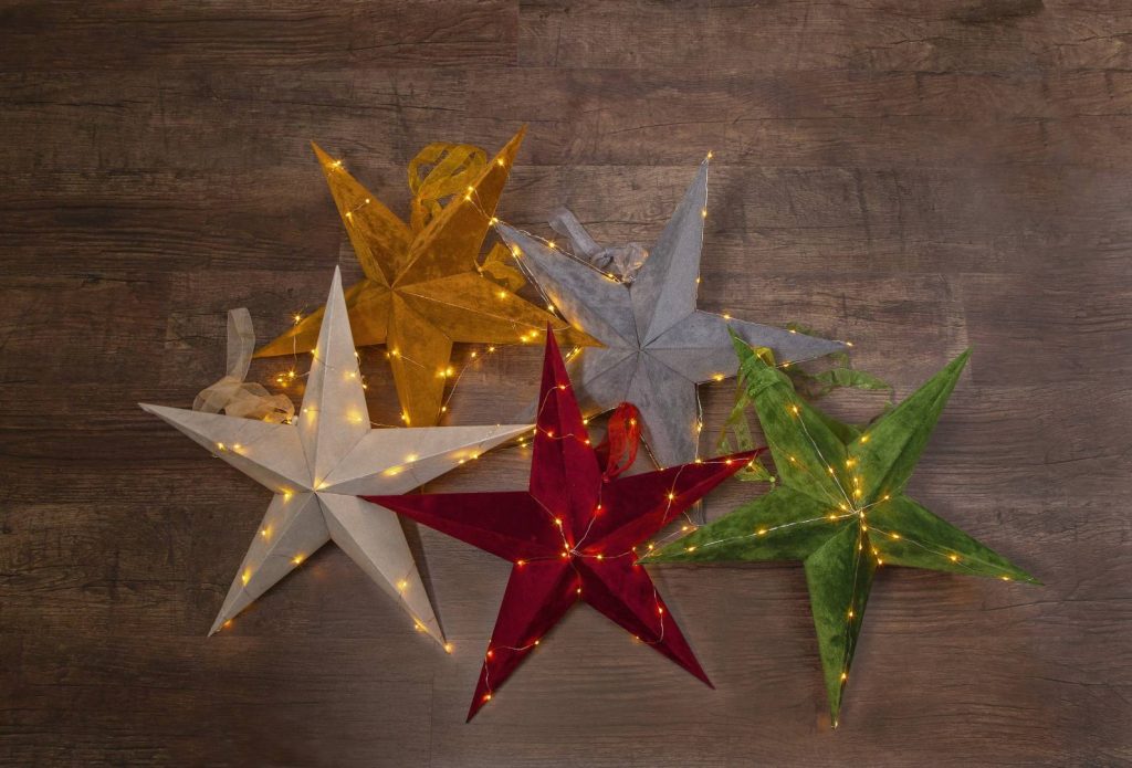 Samettipintainen paperitähti sisäkäyttöön. Pakkaus sisältää tähden ja