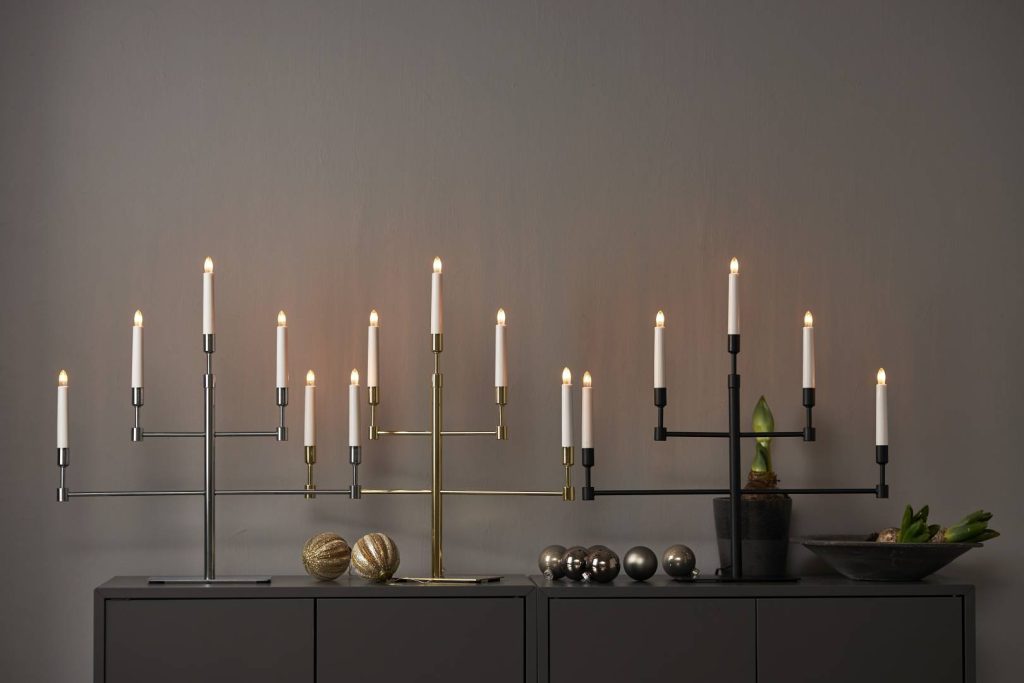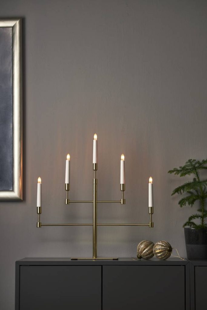Moderni metallikynttelikkö, joka sopii jouluajan koristeeksi esimerkiksi ikkunalaudalle tai lipaston päälle.