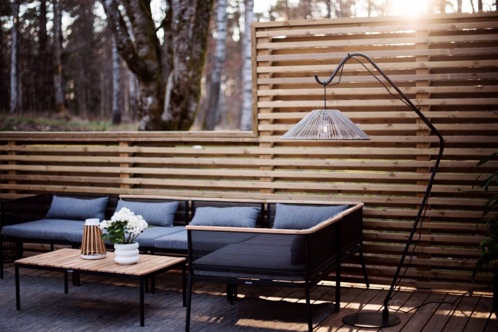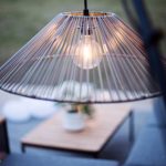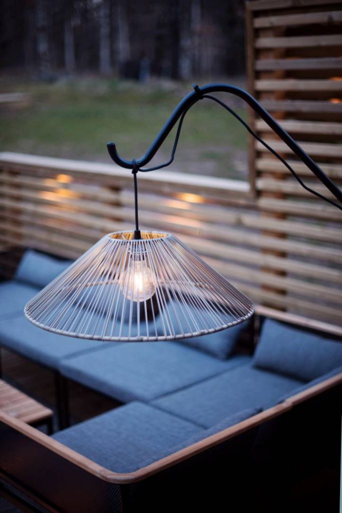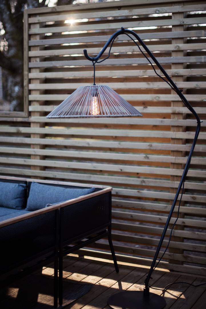 Beige ulkokäyttöön sopiva varjostin polyrottinkia.