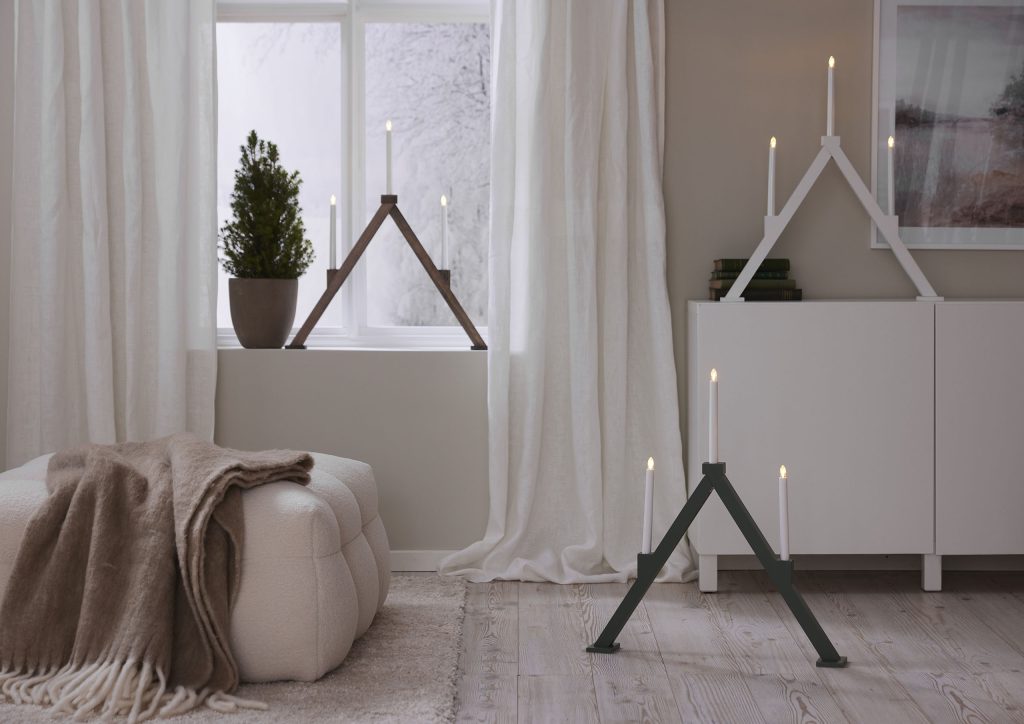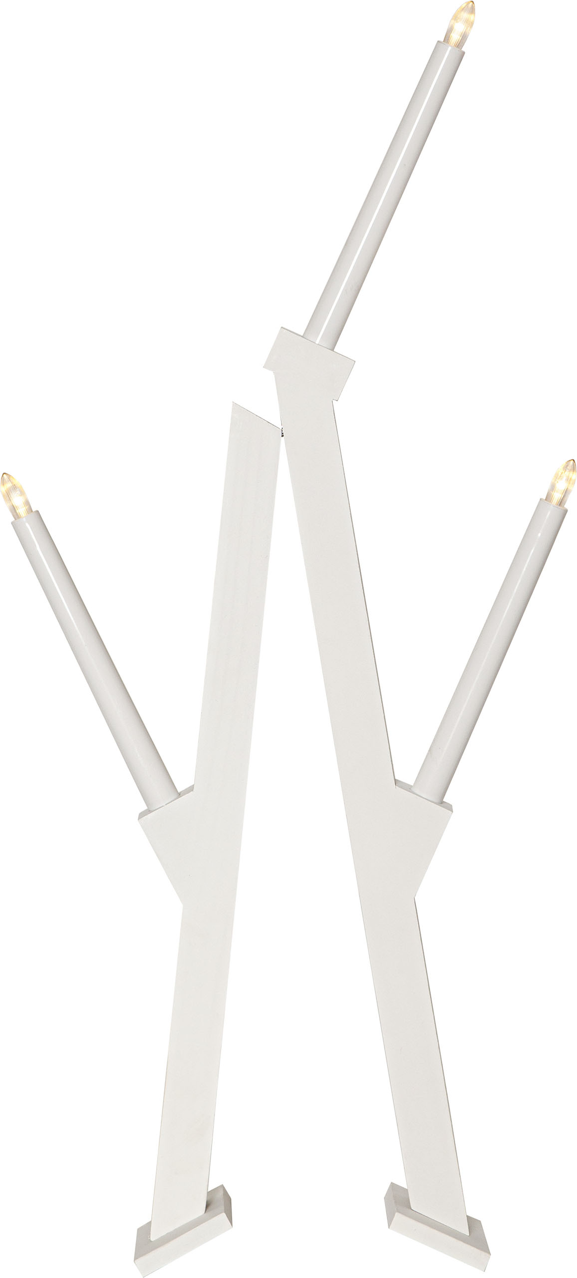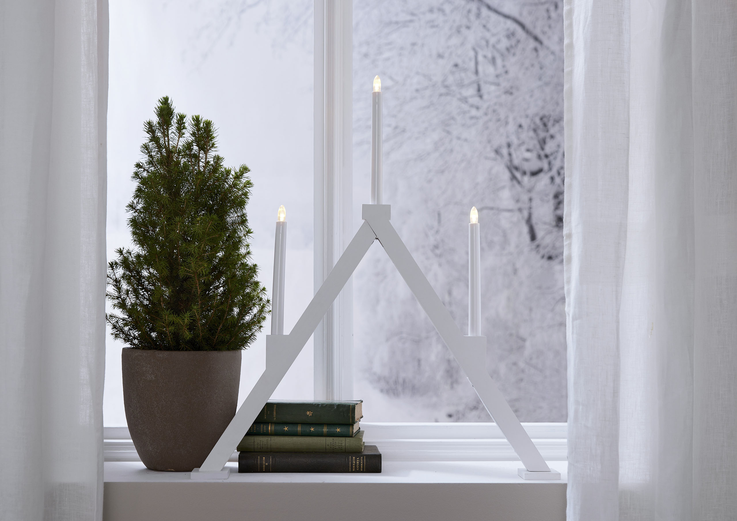 Puinen paristokäyttöinen kynttelikkö, joka on johdottomana helppo sijoittaa esimerkiksi ikkunalaudalle tai lipaston päälle. Kolme LED-lamppua loistavat kauniisti lämpimän valkoista valoa luoden kotiin jouluista tunnelmaa.