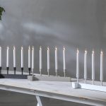 Tyylikäs moderni kynttelikkö, jonka jalusta on mustaksi petsattua puuta, kynttilänpidikkeet metallia ja kynttilät muovia.