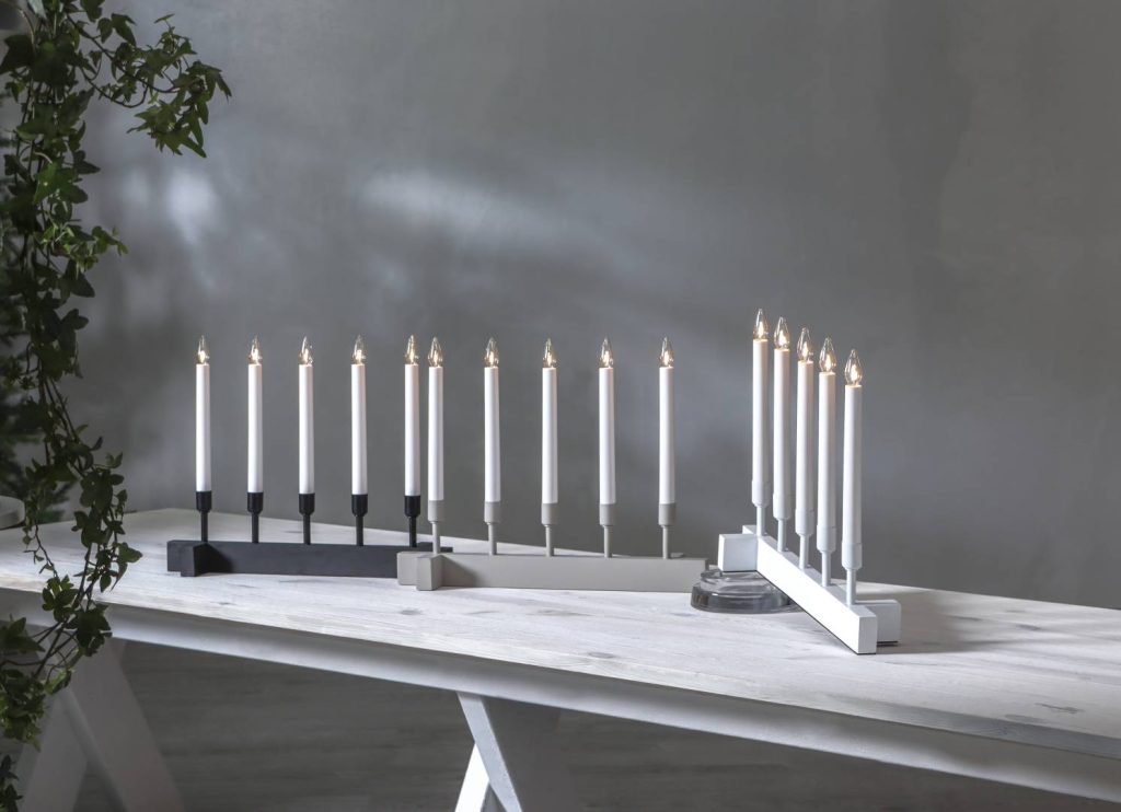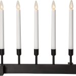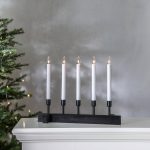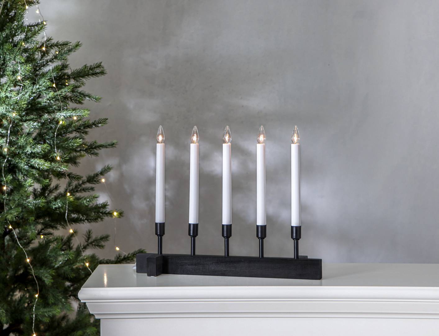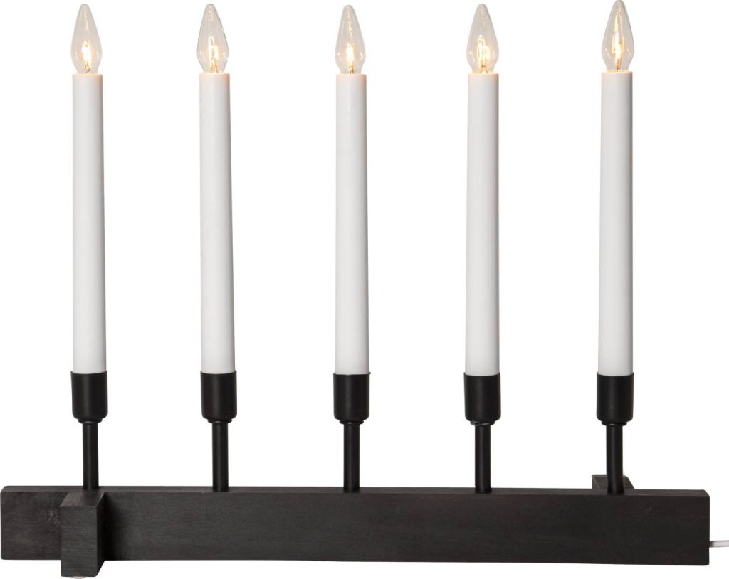 Tyylikäs moderni kynttelikkö, jonka jalusta on mustaksi petsattua puuta, kynttilänpidikkeet metallia ja kynttilät muovia.