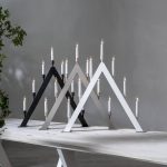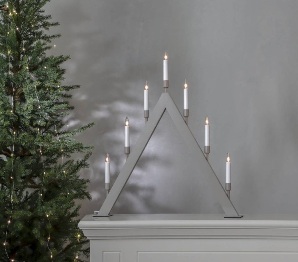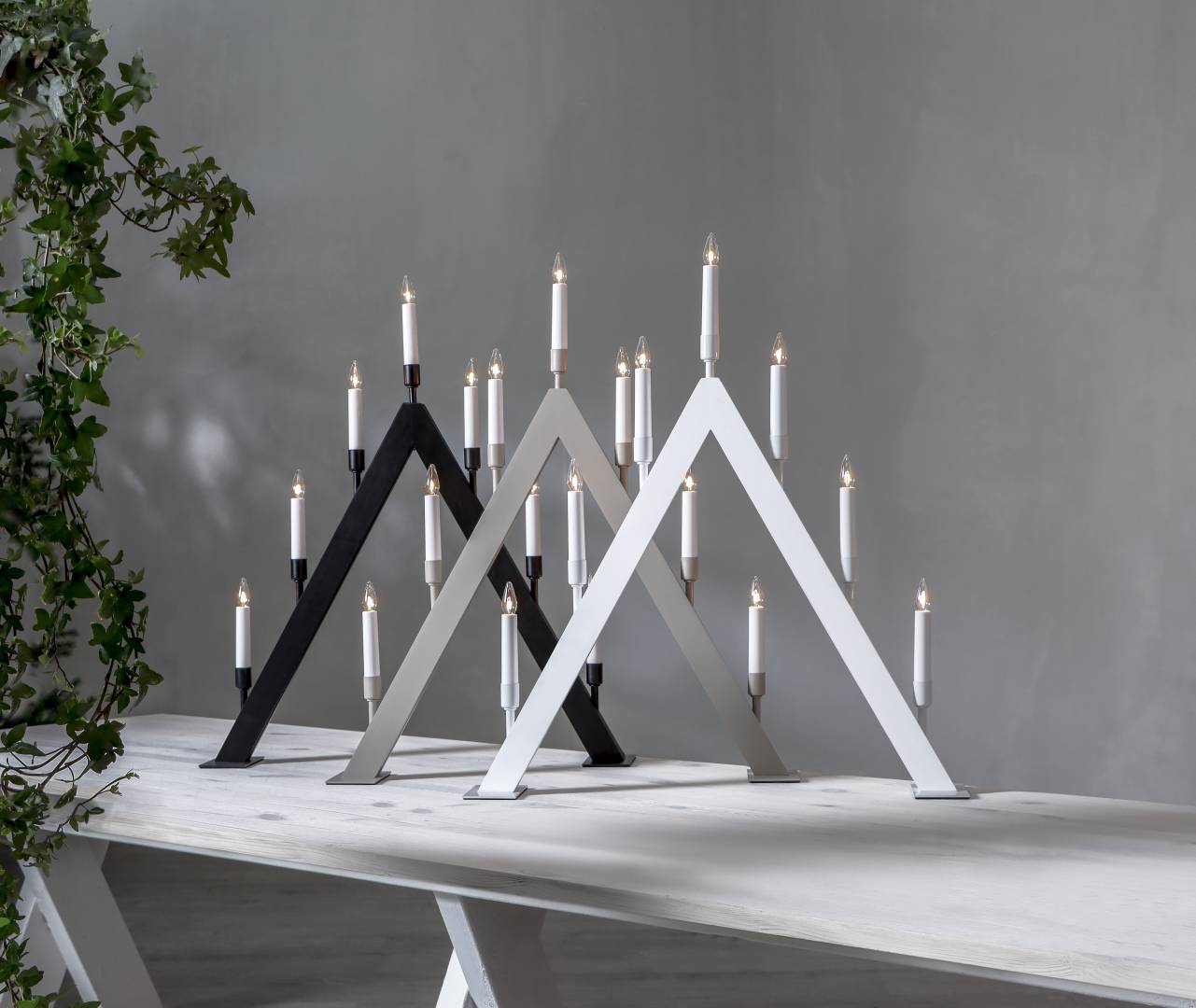 Tyylikäs A-mallinen kynttelikkö, jonka jalusta on mustaksi petsattua puuta, kynttilänpidikkeet metallia ja kynttilät muovia.