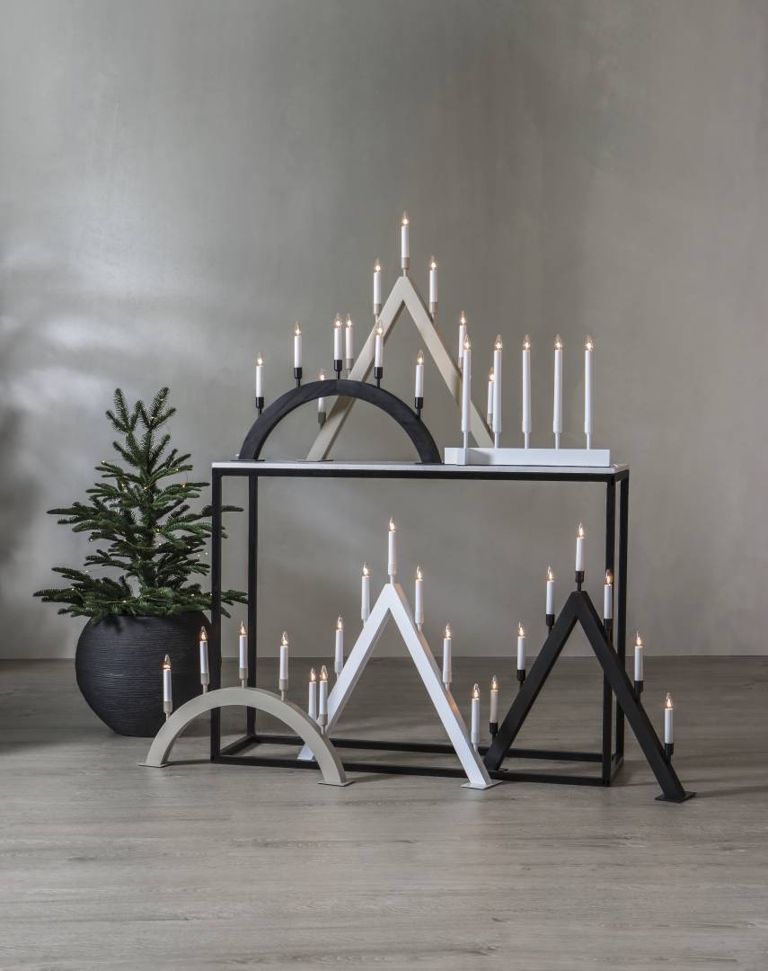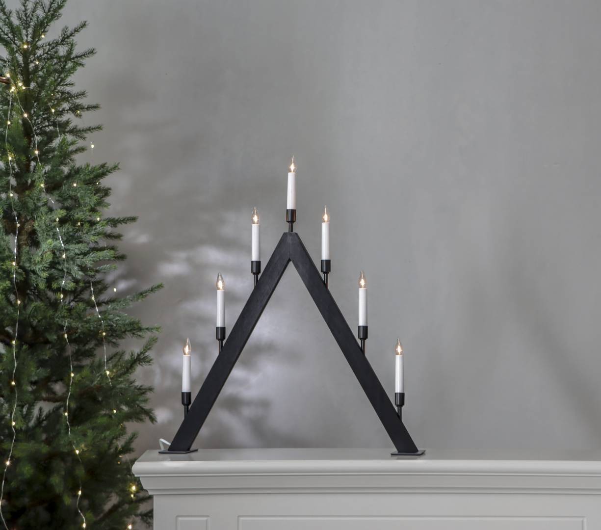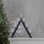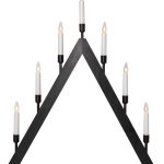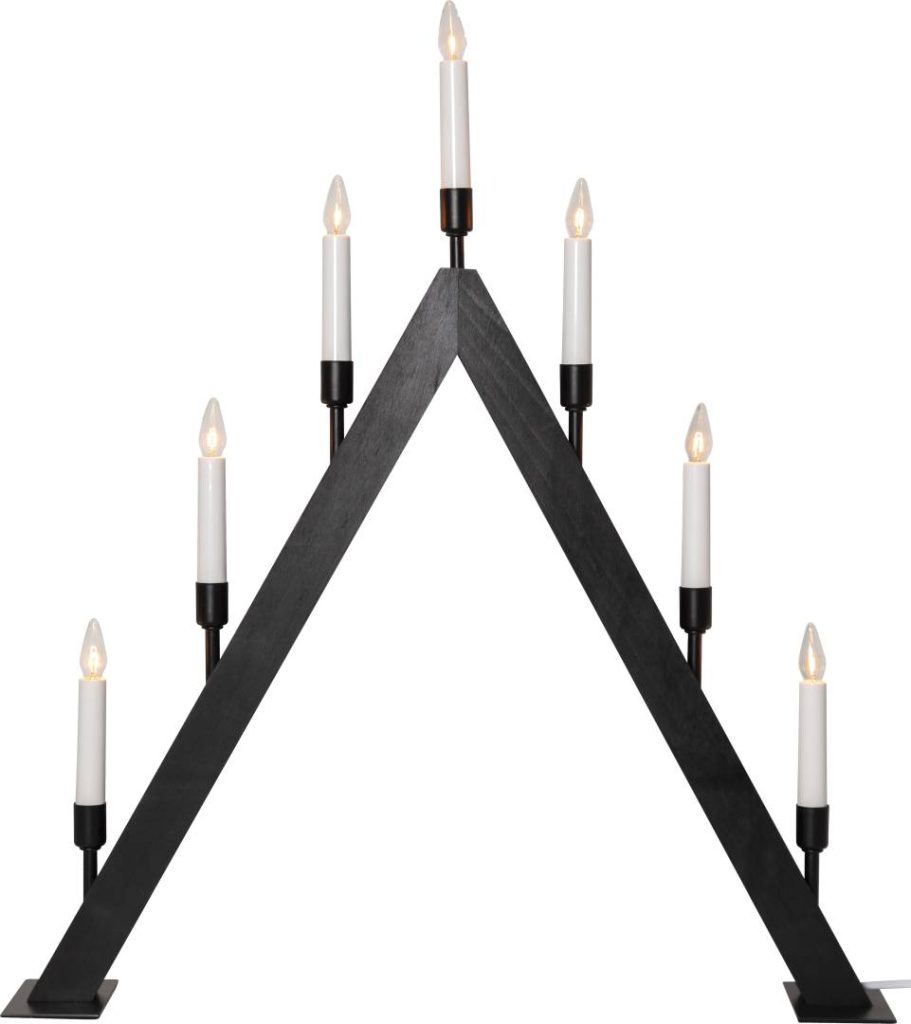 Tyylikäs A-mallinen kynttelikkö, jonka jalusta on mustaksi petsattua puuta, kynttilänpidikkeet metallia ja kynttilät muovia.