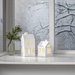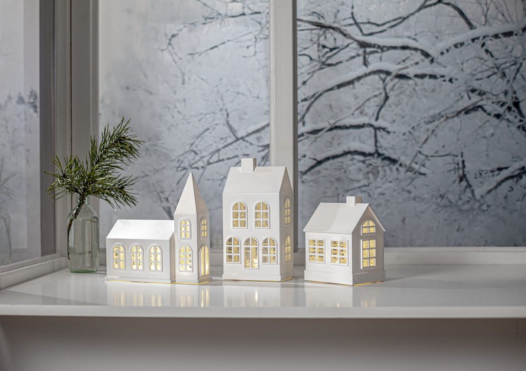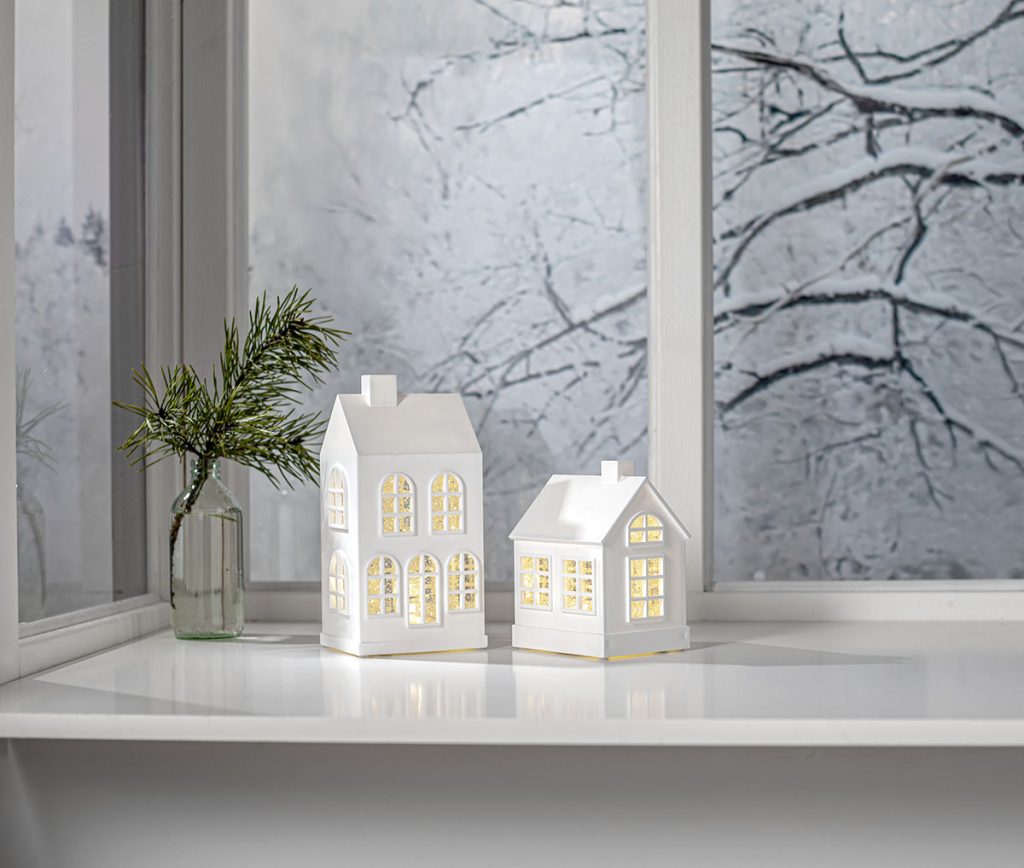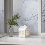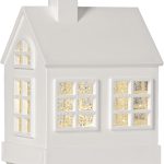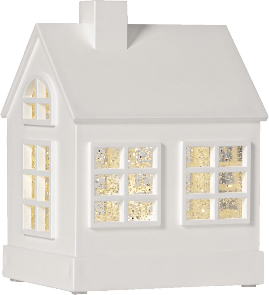 Valkoinen talolyhty, jossa on kauniit ikkunat ja sisällä glitterivettä sekä lämpimän valkoiset LED-valot. Glitterihileet liikkuvat lumisateen tavoin, kun virta on päällä.