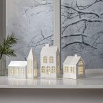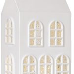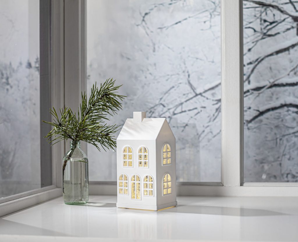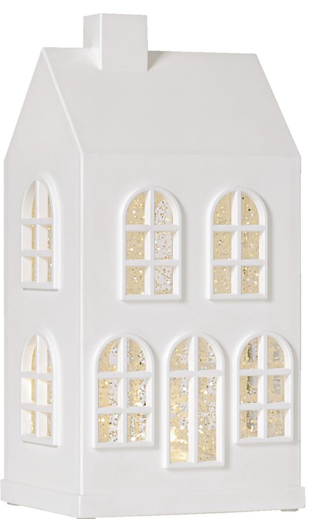 Valkoinen talolyhty, jossa on kauniit ikkunat ja sisällä glitterivettä sekä lämpimän valkoiset LED-valot. Glitterihileet liikkuvat lumisateen tavoin, kun virta on päällä.
