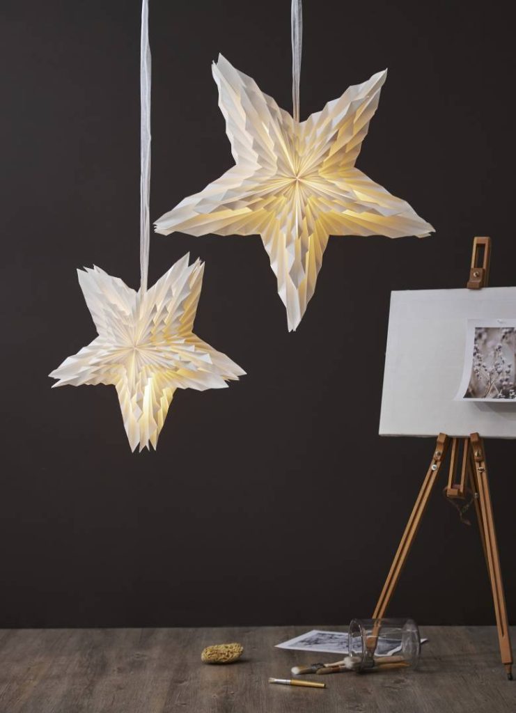 Kolmesta paperikerroksesta valmistettu kaunis valkoinen paperitähti.