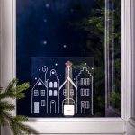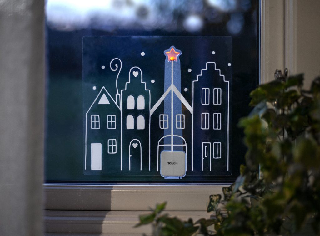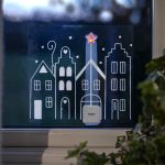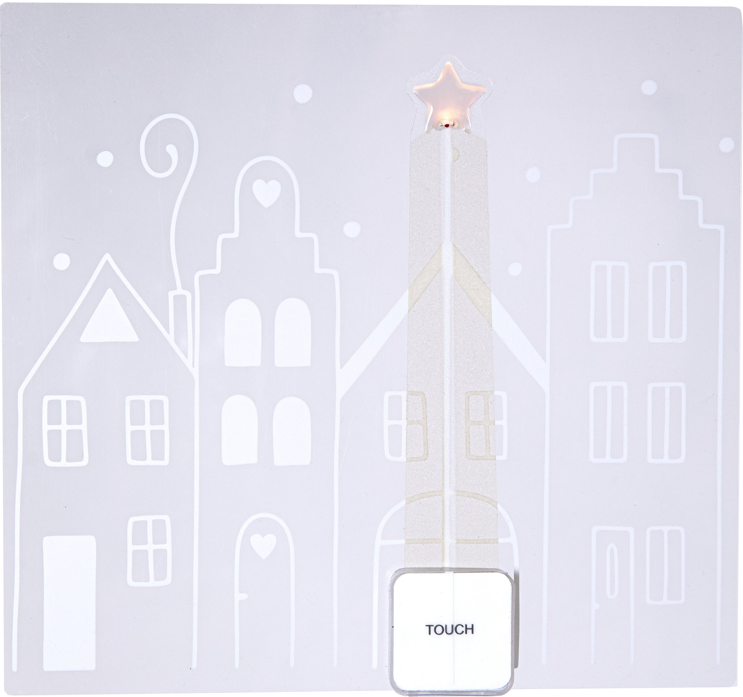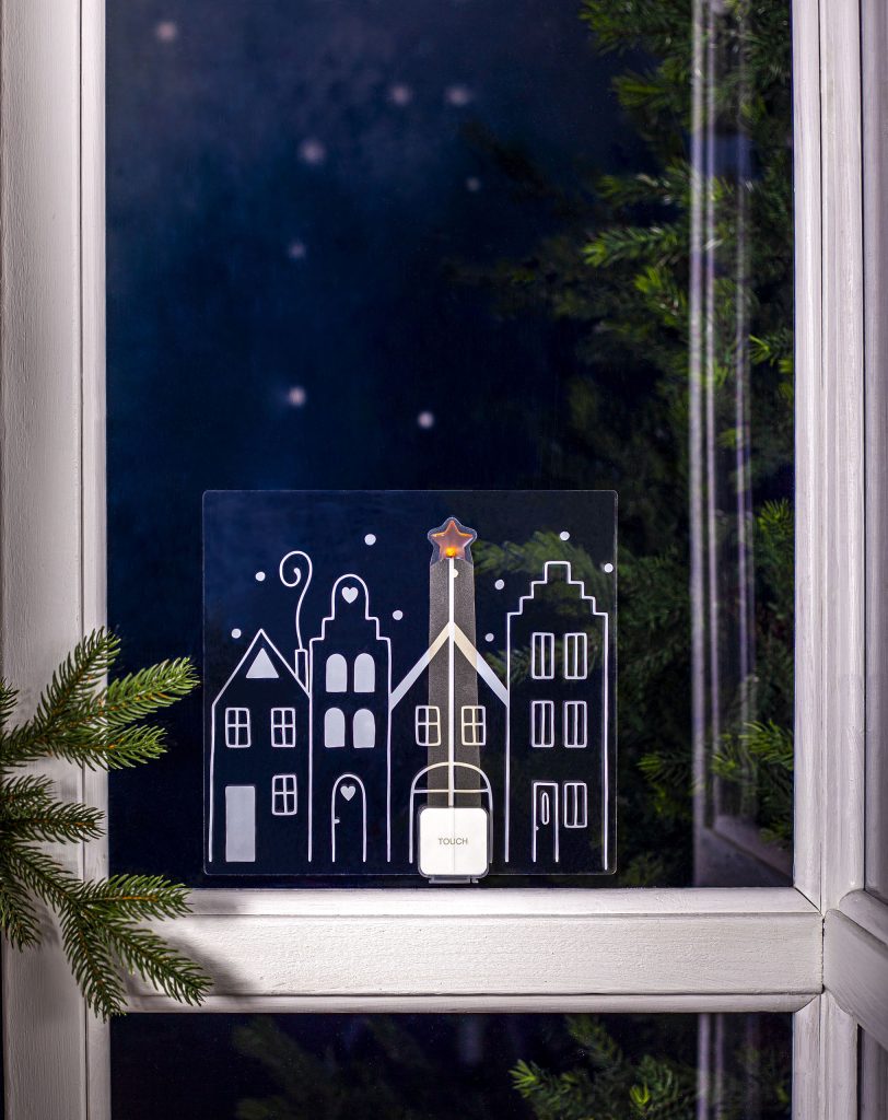 Ikkunaan tai muulle sileälle, puhtaalle pinnalle kiinnitettävä koriste. Koristeessa on neljän piirretyn tähden ääriviivat. Kiinnitä useampi koriste vierekkäin niin saat kokonaisen kaupungin! Tähdessä loistaa lämpimän valkoinen LED-valo. Kosketuskatkaisija ajastimella.