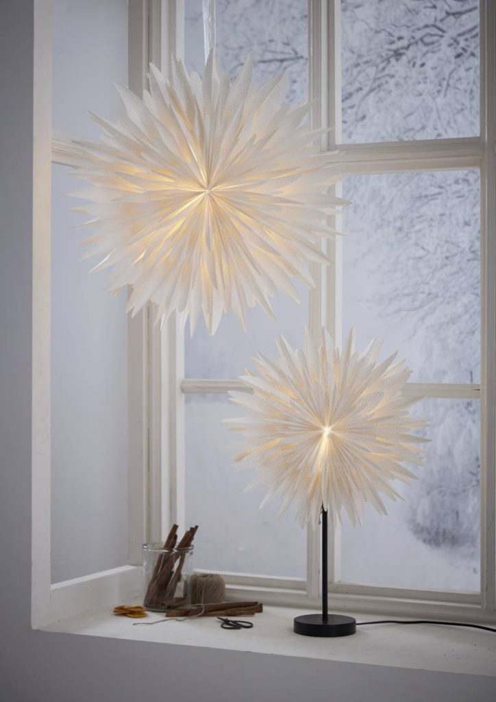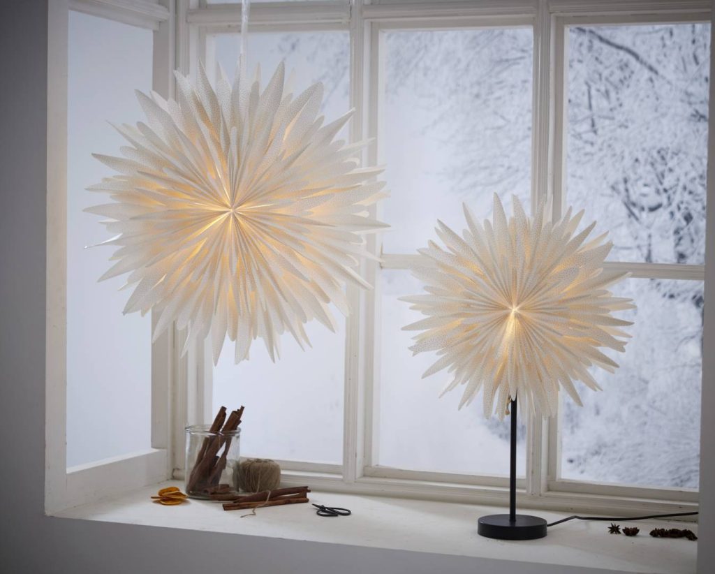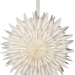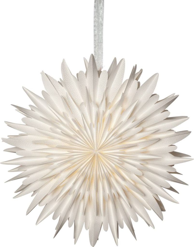 Kolmesta paperikerroksesta valmistettu upea valkoinen paperitähti. Kullanväriset pilkut.