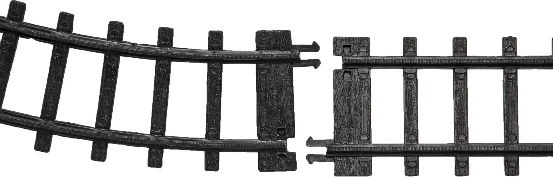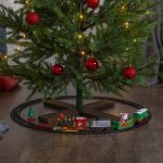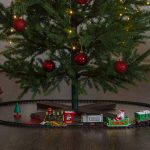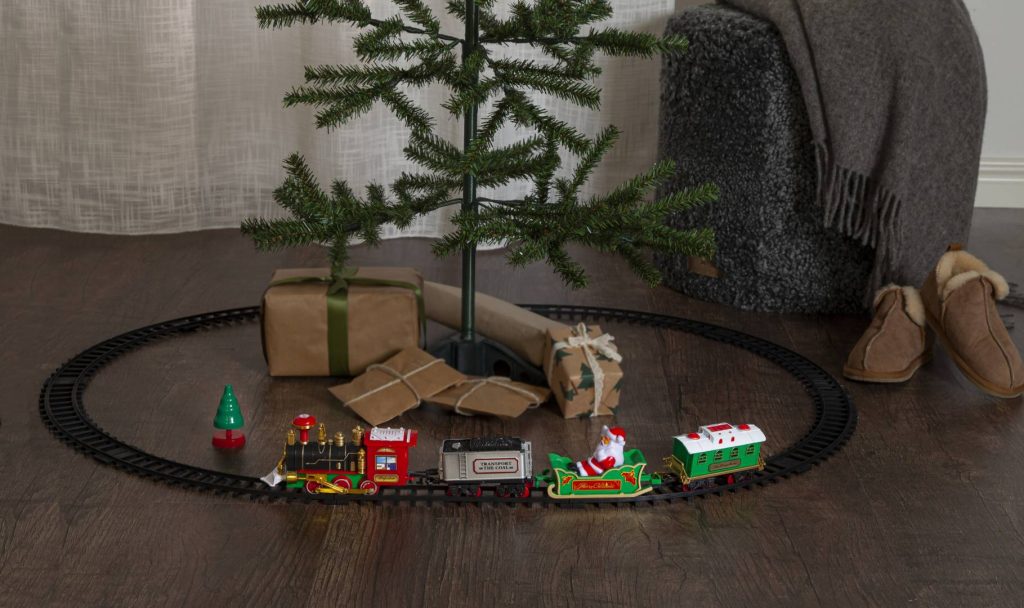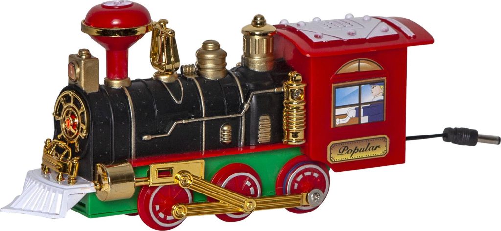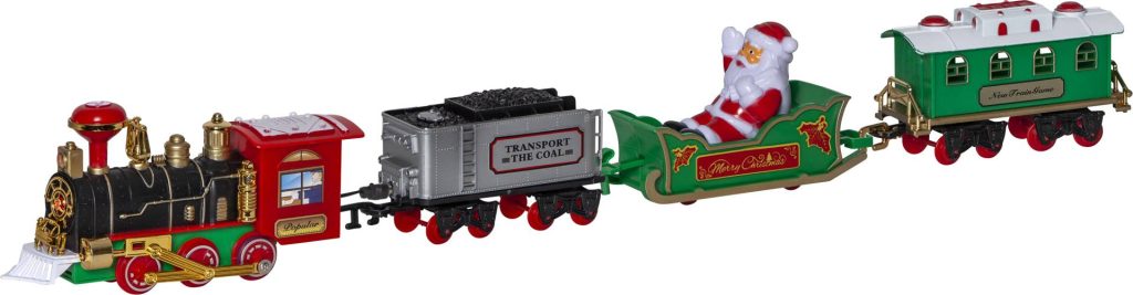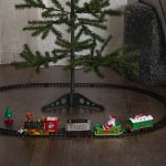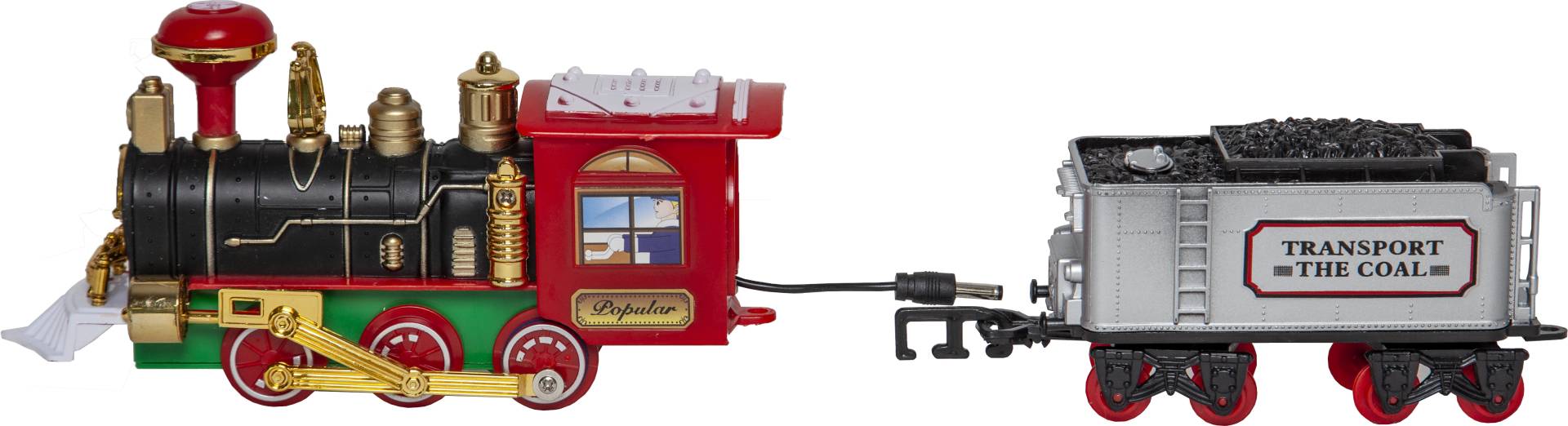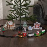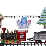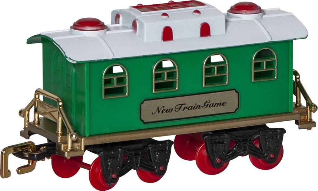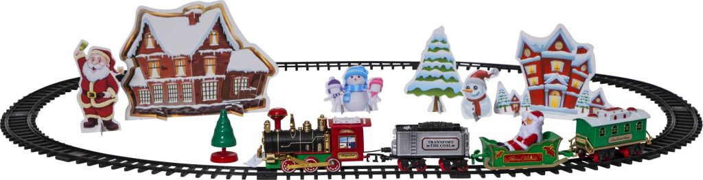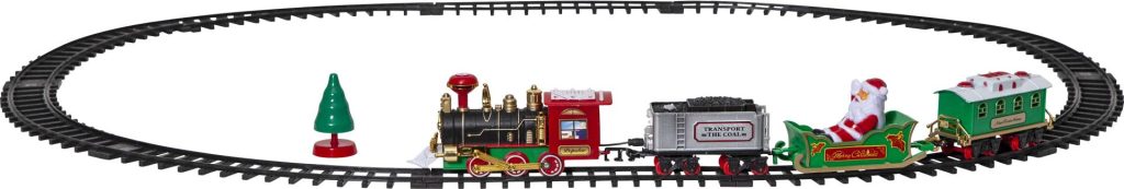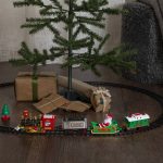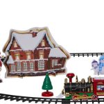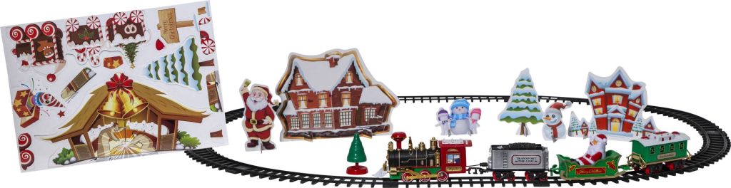 Pakkaus sisältää 10 ratapalaa, junan, ja pahviset koristeet.